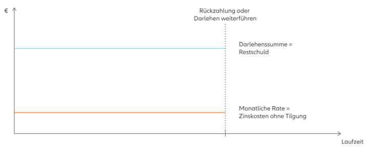 Der Verkehrswert Ihrer schuldenfreien Immobilie beträgt 675.000 Euro. Sie möchten 22,2 Prozent des Verkehrswertes als Kredit erhalten. Das entspricht einem Darlehen in Höhe von 150.000 Euro. Die Zinsen werden für 25 Jahre festgeschrieben. Sie erhalten das Darlehen als Einmalbetrag und zahlen für die Zinsbindungszeit – je nach Energieeffizienzklasse Ihrer Immobilie – nur die monatlichen Zinsen. Diese betragen aktuell zwischen 3,90 Prozent und 4,20 Prozent.