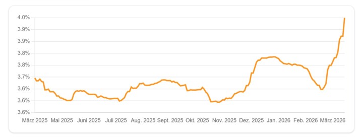 Tatsächlich haben die Zinsen für zehnjährige Baufinanzierungen innerhalb eines Monats um fast 0,3 Prozentpunkte zugelegt. Laut Biallo Baugeld-Index lagen sie Ende Februar effektiv noch bei 3,67 Prozent. Derzeit sind es 3,95 Prozent (siehe Grafik). Das ist der höchste Stand seit Ende 2023.