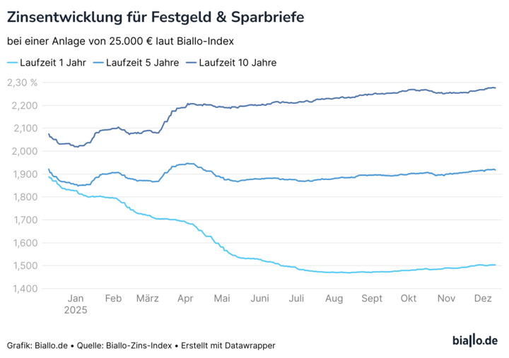 Lange Laufzeiten von beispielsweise fünf oder zehn Jahren bieten aktuell meist mehr Zinsen als kurze von einem oder zwei Jahren. Zuletzt haben sich die Zinssätze aber über alle Laufzeiten hinweg erholt und sind in den letzten Monaten stabil geblieben.
