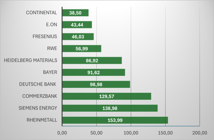 Spitzenreiter im Dax war 2025 erneut die Aktie des Rüstungskonzerns Rheinmetall. Das war auch schon 2024 so. Diesmal legte das Papier um mehr als 150 Prozent zu (siehe Grafik). Der Konzern profitiert nach wie vor von hohen Verteidigungsausgaben. Dahinter folgt Siemens Energy mit einem Kurszuwachs von fast 140 Prozent. Das Unternehmen hat seine starke Position im Bereich Energienetze und Energiewende weiter ausgebaut.