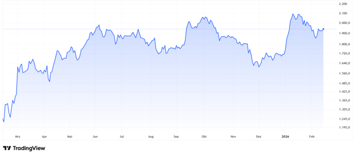 Die BAE-Aktie wird an der Londoner Börse in Britischen Pence gehandelt. Mitte Januar erreichte sie mit 2.159 Pence ein neues Allzeithoch – das sind 21,59 britische Pfund. Danach hat der Kurs geschwächelt – Zeichen des abnehmenden Hypes im Rüstungssektor (siehe Chart).
