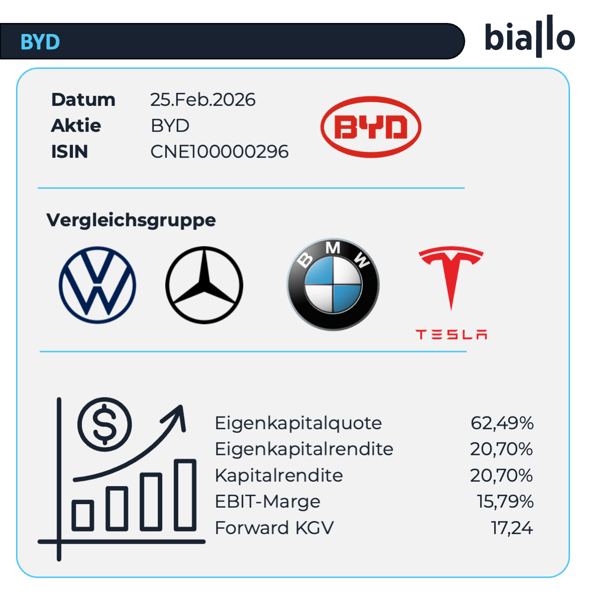 In unserer Analyse vergleichen wir BYD mit Tesla, BMW, Mercedes und VW. In gut einem Dutzend Kennzahlen zu Wachstum, Rentabilität und Bewertung erreicht BYD neun von 13 möglichen Punkten – Platz zwei, gleichauf mit BMW.