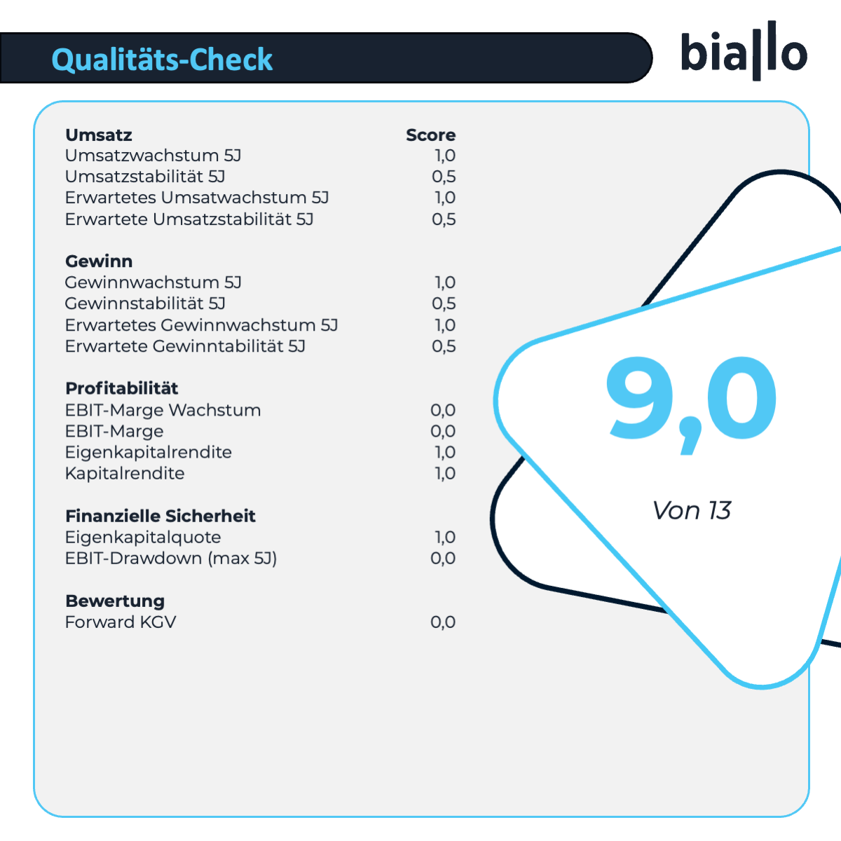 Bei der "Aktie der Woche" vergleicht Biallo regelmäßig große Unternehmen aus verschiedenen Branchen. Wir ziehen dafür gut ein Dutzend Kennzahlen heran. Dazu zählen Umsatz- und Gewinnwachstum, Rentabilität oder die Analystenbewertung. Für jede Kategorie gibt es einen Punkt, wenn das Unternehmen in der Kategorie unter den Top 3 in der Vergleichsgruppe liegt. Beim Wachstum berechnen wir zusätzlich die Stabilität: Liegt sie über einem definierten Schwellenwert, gibt es einen halben Zusatzpunkt. Insgesamt werden in elf Kategorien je ein Punkt und zusätzlich je ein halber Punkt für vier Stabilitätskriterien vergeben – maximal also 13 Punkte.
