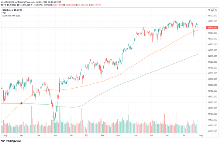 Beispiele einer 90-Tage-Linie (rot) und 200-Tage-Linie (grün) des deutschen Leitindex Dax. Quelle: Tradingview.com.