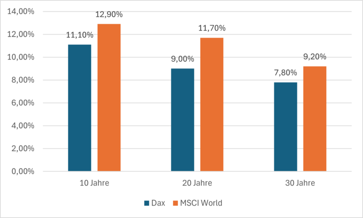 Demnach lassen sich mit der langfristigen und regelmäßigen Investition in einen Aktien-Index wie den DAX oder den Weltindex MSCI World ansehnliche Erträge erwirtschaften. „Aktien sind bei langfristiger, breit gestreuter und kontinuierlicher Anlage ein zuverlässiges Instrument für Vermögensaufbau und Altersvorsorge“, so das Aktieninstitut.
