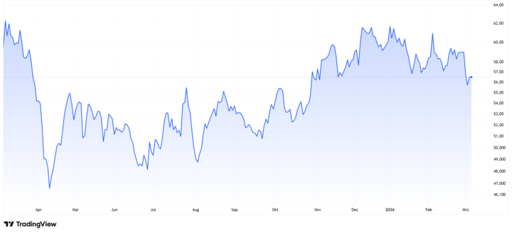 Die Mercedes-Aktie notiert aktuell bei knapp 57 Euro (Stand 5. März 2026). Innerhalb der vergangenen zwölf Monate hat das Papier rund 10 Prozent verloren. Seit Ende Mitte 2025 ging es bergauf. Zuletzt schwächelte die Aktie aber wieder (siehe Grafik):