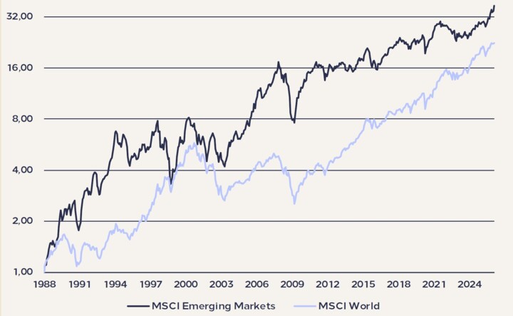 Die Auswertung von Pascal Kielkopf, Kapitalmarktanalyst bei HQ Trust, zeigt: Seit 1988 haben Aktien aus Schwellenländern – sogenannte „Emerging Markets“ – im Durchschnitt eine deutlich höhere Rendite erzielt als Aktien aus Industrieländern. Kielkopf zeigt das mit einem Vergleich der Wertentwicklung des MSCI World und des MSCI Emerging Markets (siehe Chart).