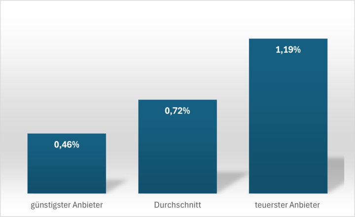 So machen einige Anbieter die Gebühr von der Höhe der Anlagesumme abhängig. In der Regel wird es dabei für Anleger günstiger, je größer der Anlagebetrag ist. Die Performance nach Abzug der Kosten lässt sich daher am besten für eine bestimmte Anlagesumme vergleichen. Die folgende Grafik zeigt die Spannbreite der Servicegebühr für einen Anlagebetrag von 10.000 Euro: Sie reicht von 0,46 Prozent der Anlagesumme beim günstigsten Anbieter bis 1,19 Prozent beim teuersten: