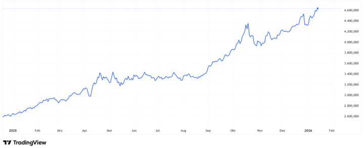 Schon im vergangenen Jahr hat der Preis für das Edelmetall mehrere Höchststände durchbrochen. Insgesamt legte der Goldkurs 2025 um fast 70 Prozent zu (in Dollar). Seit Jahresanfang 2026 liegt das Plus bereits bei fast sechs Prozent.