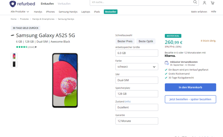 Für 260,99 Euro (Stand 29.09.2022) gibt es ein Samsung Galaxy A 52S 5G mit 128 GB Speicherplatz bei Refurbed.de Zustand: „exzellent“.