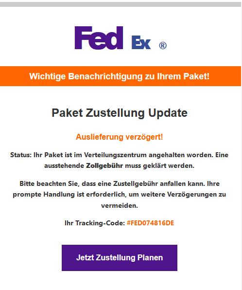 FedEx: Wir warten auf die Zahlung der Versandkosten für Ihr Paket F8265858458. Bitte regeln Sie Ihre Situation auf ..., damit die Lieferung pünktlich erfolgt.