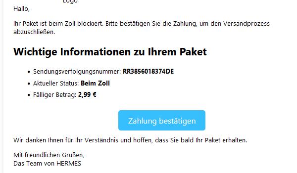 HERMES :Für Ihr Paket sind Zollabgaben unter der Nummer DE762NRM4 zu entrichten. Um die Zustellung fortzusetzen, klicken Sie bitte auf den folgenden Link: https://...